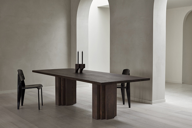 The Brut Table takes cues from Brutalism and Amsterdam School architecture. Voluminous columns with a monumental aesthetic support the heavy table top. The table is designed by Aad Bos and crafted in the Netherlands. Available in solid European oak and American walnut, finished in several colors. Custom made in any size, with a production time of 6-8 weeks.